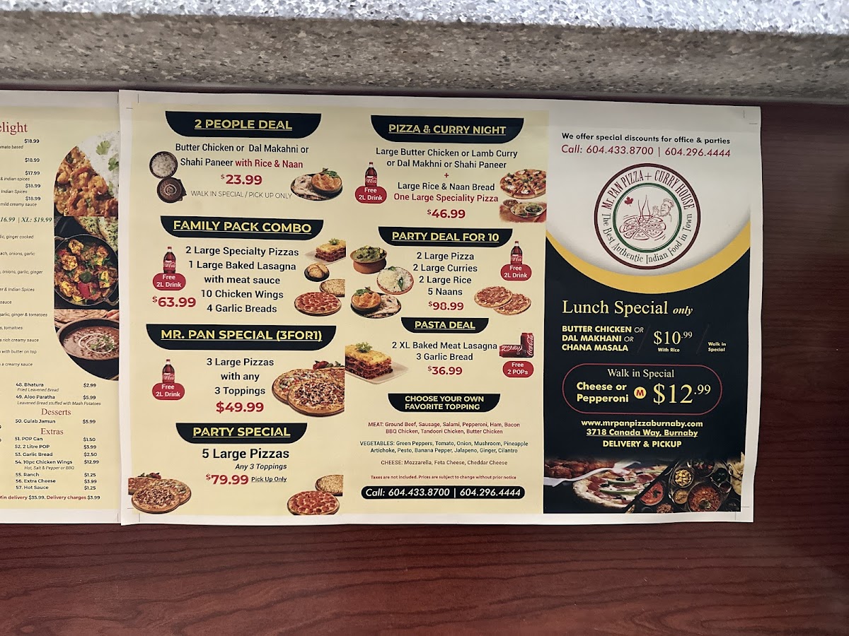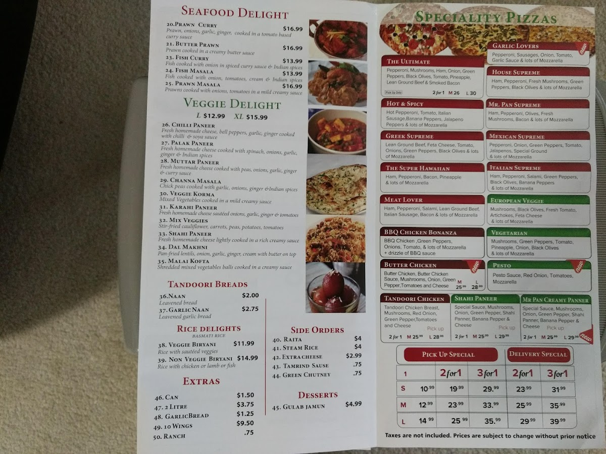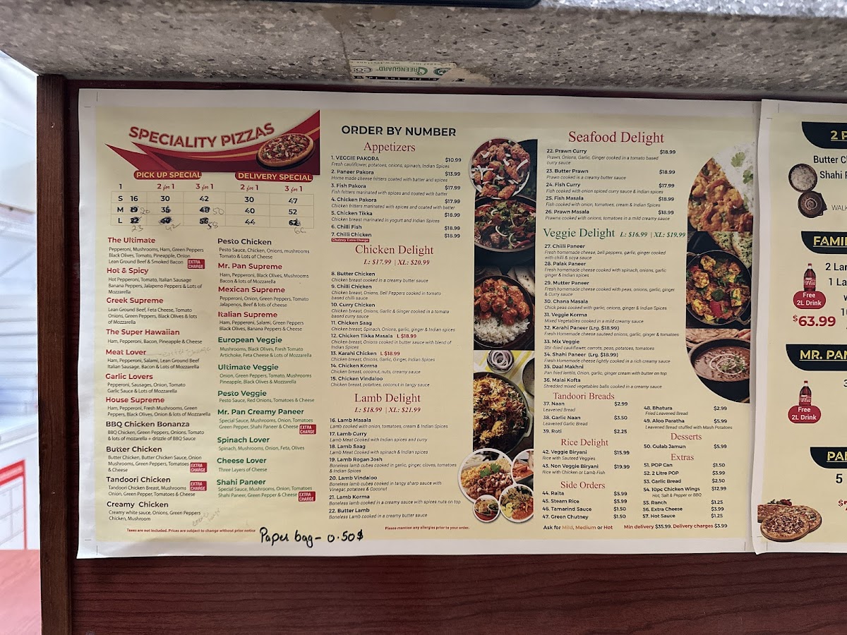 The menu at Mr. Pan Pizza offers a diverse and rich selection that caters to various tastes. For appetizers, you can start with Veggie Pakora or Paneer Pakora, or opt for Chicken Pakora or Fish Pakora, all offering crispy, flavorful bites. The Chicken Tikka is also a great choice. If you're a fan of seafood, the Prawn Curry and Butter Prawn are standout dishes, along with the Fish Masala and Prawn Masala. For chicken lovers, dishes like Butter Chicken, Chilli Chicken, and Chicken Tikka Masala bring bold, aromatic flavors. Lamb options include Lamb Masala, Lamb Rogan Josh, and the fiery Lamb Vindaloo. Vegetarians can delight in dishes like Chilli Paneer, Palak Paneer, and Chana Masala, with the Veggie Korma being a creamy, rich choice. Rice lovers will enjoy the Veggie Biryani and Non-Veggie Biryani for a fragrant, hearty meal. For dessert, the Gulab Jamun is a perfect sweet finish.