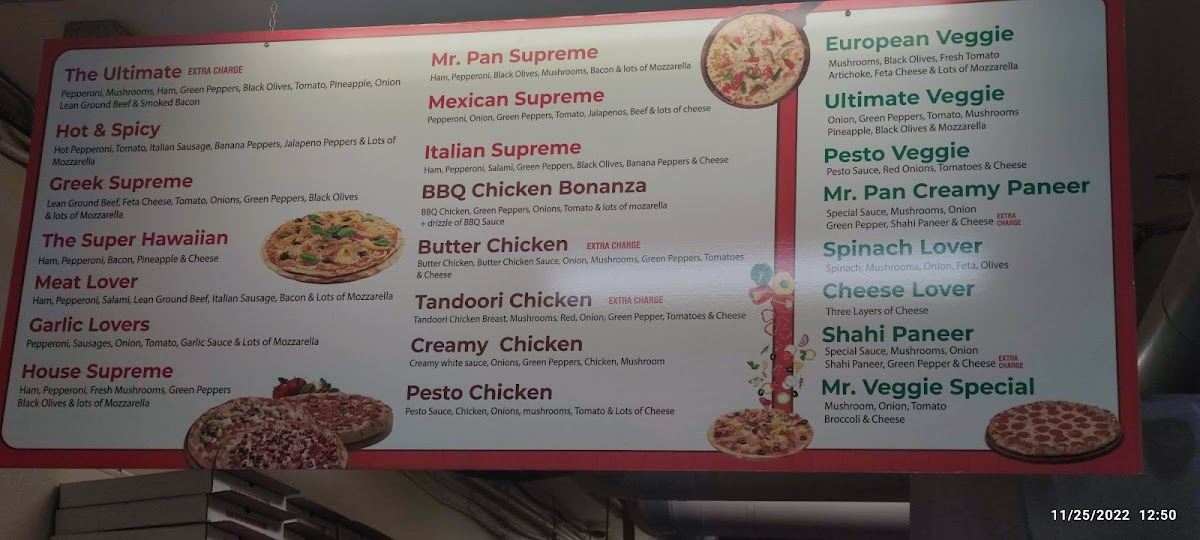 The restaurant also features a variety of extras like Garlic Bread, 54.10pc Chicken Wings, and side orders such as Raita and Steam Rice. The Tandoori Breads selection, including Naan and Garlic Naan, complements the main dishes perfectly. For lunch, there's a special offering with options like Butter Chicken, Dal Makhani, and Chana Masala. On the pizza front, Mr. Pan Pizza has options like The Ultimate, Hot & Spicy, and Greek Supreme, along with other creative pizzas like Meat Lover and BBQ Chicken Bonanza. With such a variety of flavorful dishes, Mr. Pan Pizza is sure to satisfy any craving, whether you're in the mood for a hearty curry, a cheesy pizza, or a flavorful biryani.